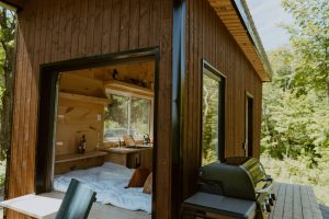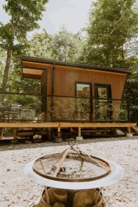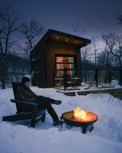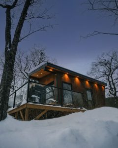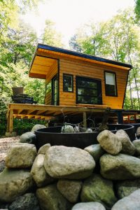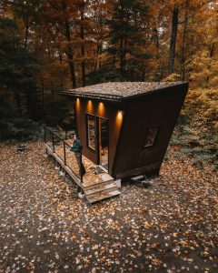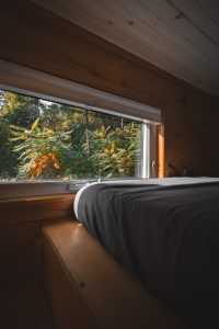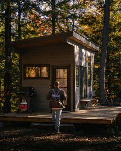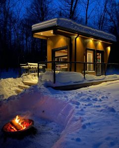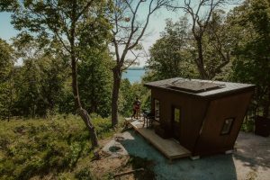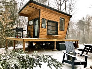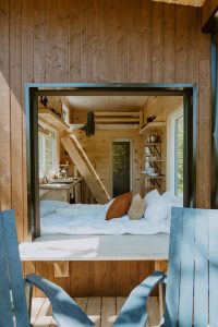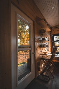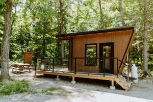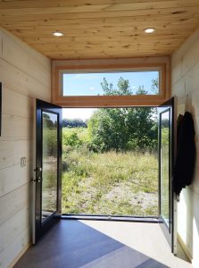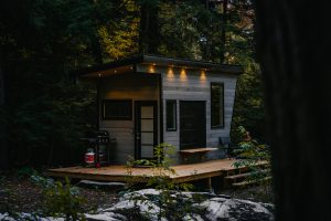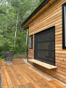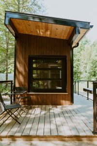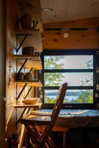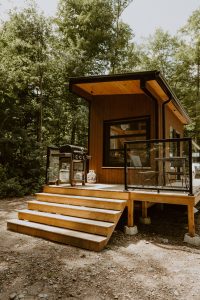 Our “Elm” models is our most compact bunkie design. It includes a toilet room and “mud room” space as well as a composting toilet. A kitchenette is optional (plumbing may require a permit).