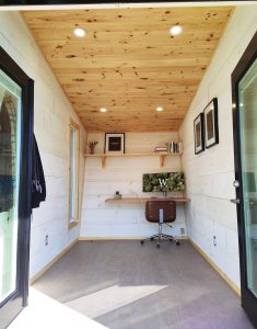 Our “Birch” model offers modern design with classic wood finishing. Cedar trim, pine board interior and cork flooring give the “Birch” a sleek style that’s perfect for a home office or bunkie space. No permits required!