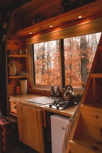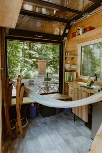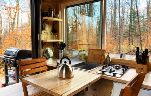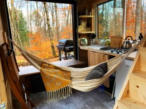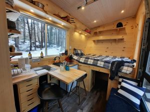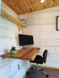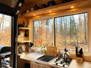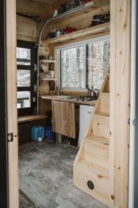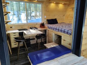 Our “Maple” models offers a floor level queen bed and a composting toilet or storage room. A kitchenette is also optional (plumbing may require a permit).